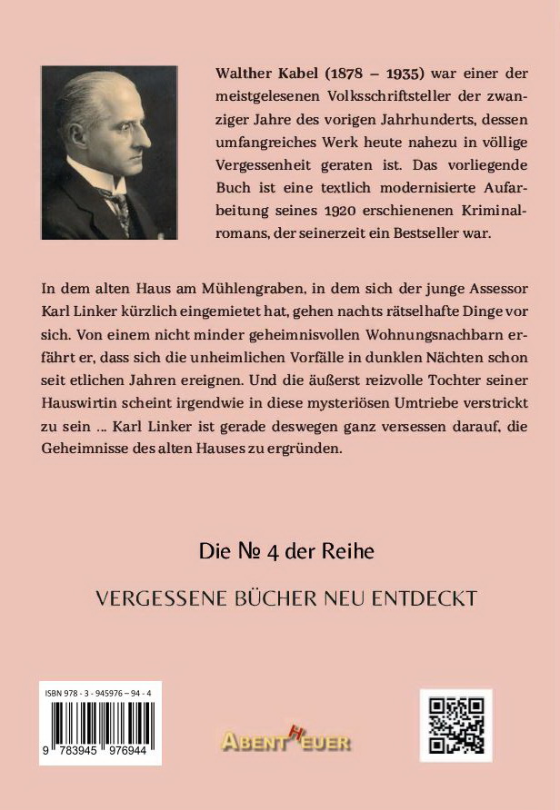 Walther Kabel (1878 – 1935) war einer der meistgelesenen Volksschriftsteller der zwanziger Jahre des vorigen Jahrhunderts, dessen umfangreiches Werk heute nahezu in völlige Vergessenheit geraten ist. Das vorliegende Buch ist eine textlich modernisierte Aufarbeitung seines 1920 erschienenen Kriminalromans, der seinerzeit ein vielgelesener Bestseller war.