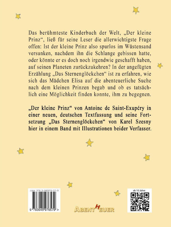 Das berühmteste Kinderbuch der Welt, DER KLEINE PRINZ von Antoine de Saint-Exupéry in einer neuen, deutschen Textbearbeitung und seine Fortsetzung DAS STERNENGLÖCKCHEN von Karel Szesny hier in einem Band mit Illustrationen beider Verfasser.