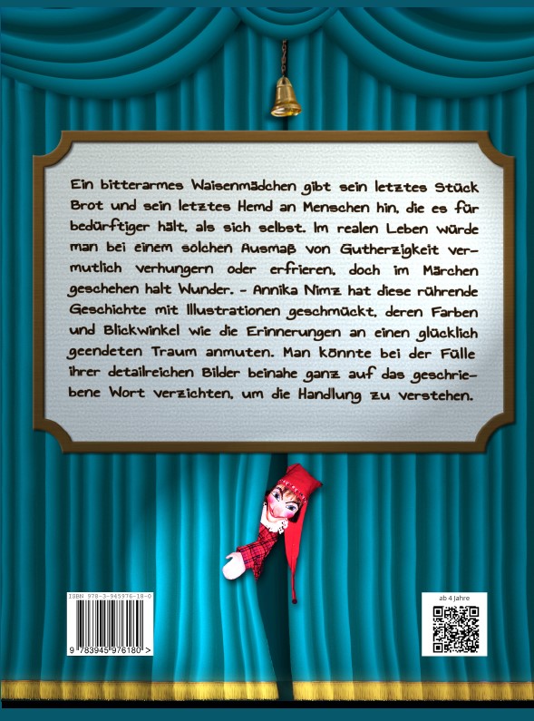 Ein bitterarmes Waisenmädchen gibt sein letztes Stück Brot und sein letztes Hemd an Menschen hin, die es für bedürftiger hält als sich selbst. Im realen Leben würde man bei einem solchen Ausmaß von Gutherzigkeit vermutlich verhungern oder erfrieren, doch im Märchen geschehen halt Wunder. – Annika Nimz hat diese rührende Geschichte mit Illustrationen geschmückt, deren Farben und Blickwinkel wie die Erinnerungen an einen glücklich geendeten Traum anmuten. Man könnte bei der Fülle ihrer detailreichen Bilder beinahe ganz auf das geschriebene Wort verzichten, um die Handlung zu verstehen.